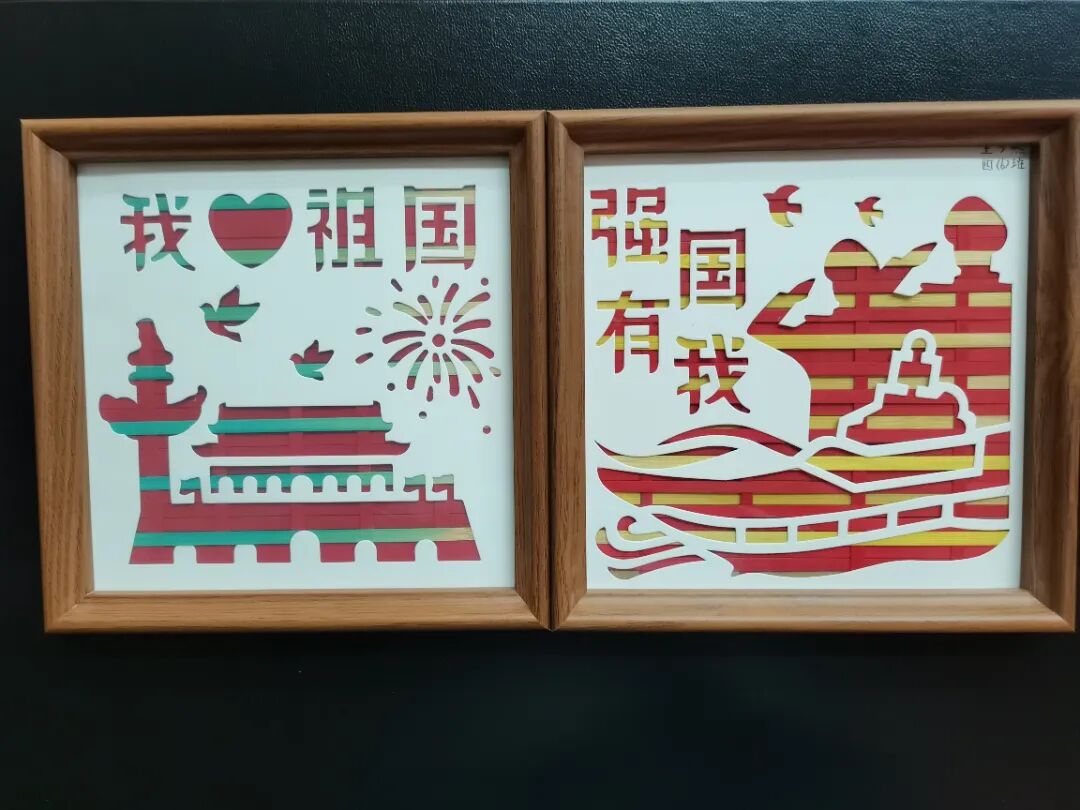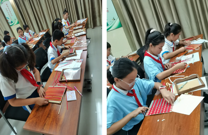 为了增强体验感,在手工互动环节安排了“我爱祖国”、“强国有我”为主题的非遗竹编画手工制作。博物馆社教老师给同学们耐心讲解竹编画制作的步骤和技巧,并现场示范。同学们按照“一挑一压”的传统技法开始细心编织竹篾。从铺底、编织到调整间隔、固定相框,指尖翻飞间,竹篾逐渐交织成“我爱祖国”、“强国有我”的画面。