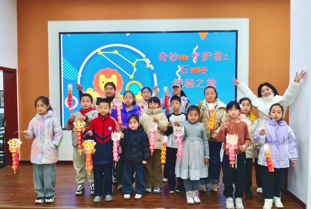 在段老师的细致讲解下,孩子们不仅学会了通过“踩绣球”“抱幼狮”的特征快速区分雌雄石狮子,还读懂了它们不同表情背后的含义——威严的神态是守护的坚定,温和的面容是对世人的慈爱。更深入了解到“教化狮”的文化内涵,知晓这些石头身躯承载着仁义、勇武与守护的古老故事,让传统文化知识变得鲜活易懂。最令人期待的手工环节,孩子们领取材料包制作狮子灯。在家长的陪伴与老师的指导下,大家有条不紊地组装框架、粘贴装饰、安装灯串,一个个造型可爱的狮子灯逐渐成型。点亮灯串的瞬间,温暖的光芒从狮子造型中透出,孩子们举着自己的作品欢呼雀跃,成就感满满。