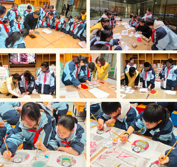 同学们认真学习印制年画的方法,在志愿者的协助下,开启了“一团和气”木版年画的制作之旅。大家先将宣纸平整铺在涂好墨汁的木刻印板上,用马莲轻轻按压,使图案清晰印在纸上。然后根据自己的喜好,在印好的图案内用颜料填色,鼓励创新配色,同时保留传统韵味,用自己的作品展现“年的味道”。