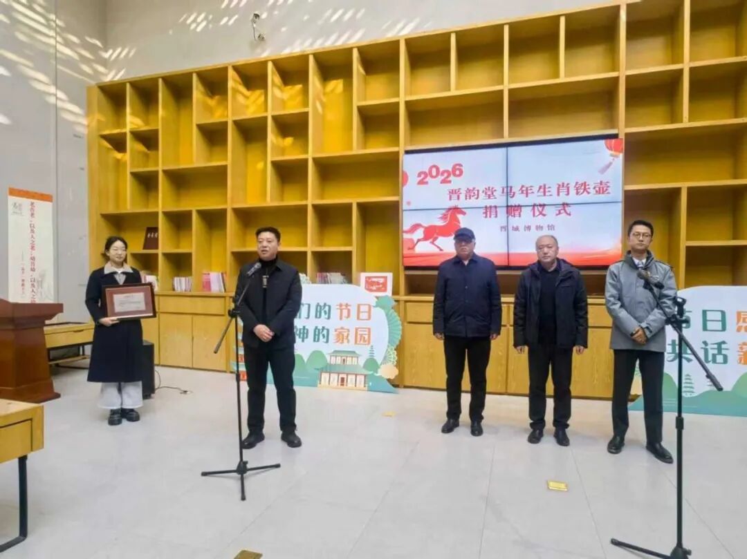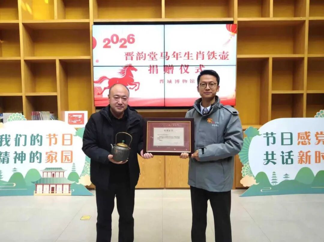 近日,一件凝结匠心与文化底蕴的马年生肖铁壶,由晋韵堂精心铸造,正式入藏晋城博物馆。12月17日上午,晋城博物馆举行了捐赠仪式。晋城市文物保护研究中心副主任何涛主持,双方主要负责同志和职工参加了捐赠仪式。晋城市文物保护研究中心副主任张清洋代表晋城博物馆接收了捐赠,并向晋韵堂代表颁发了捐赠证书。