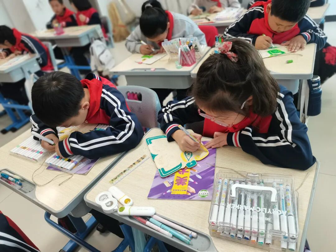 有趣的手工互动环节:平头兽面和兽面尊木质挂饰制作开始了,在博物馆社教老师的指导下,同学们开动脑筋,迫不及待动手制作,体验青铜器纹饰手工绘画的乐趣。