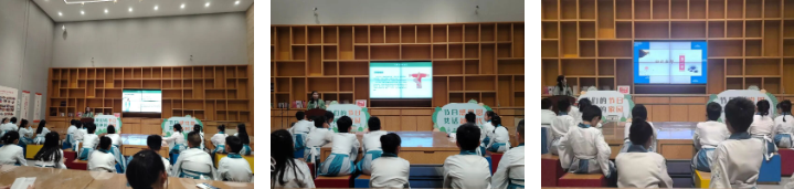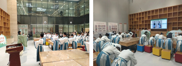 二楼青少年互动厅,身着汉服的博物馆社教老师带着同学们一起开展了别开生面的社教课,通过PPT和视频为同学们详细讲解了汉服、汉礼和拓印技艺的相关知识和传承意义。