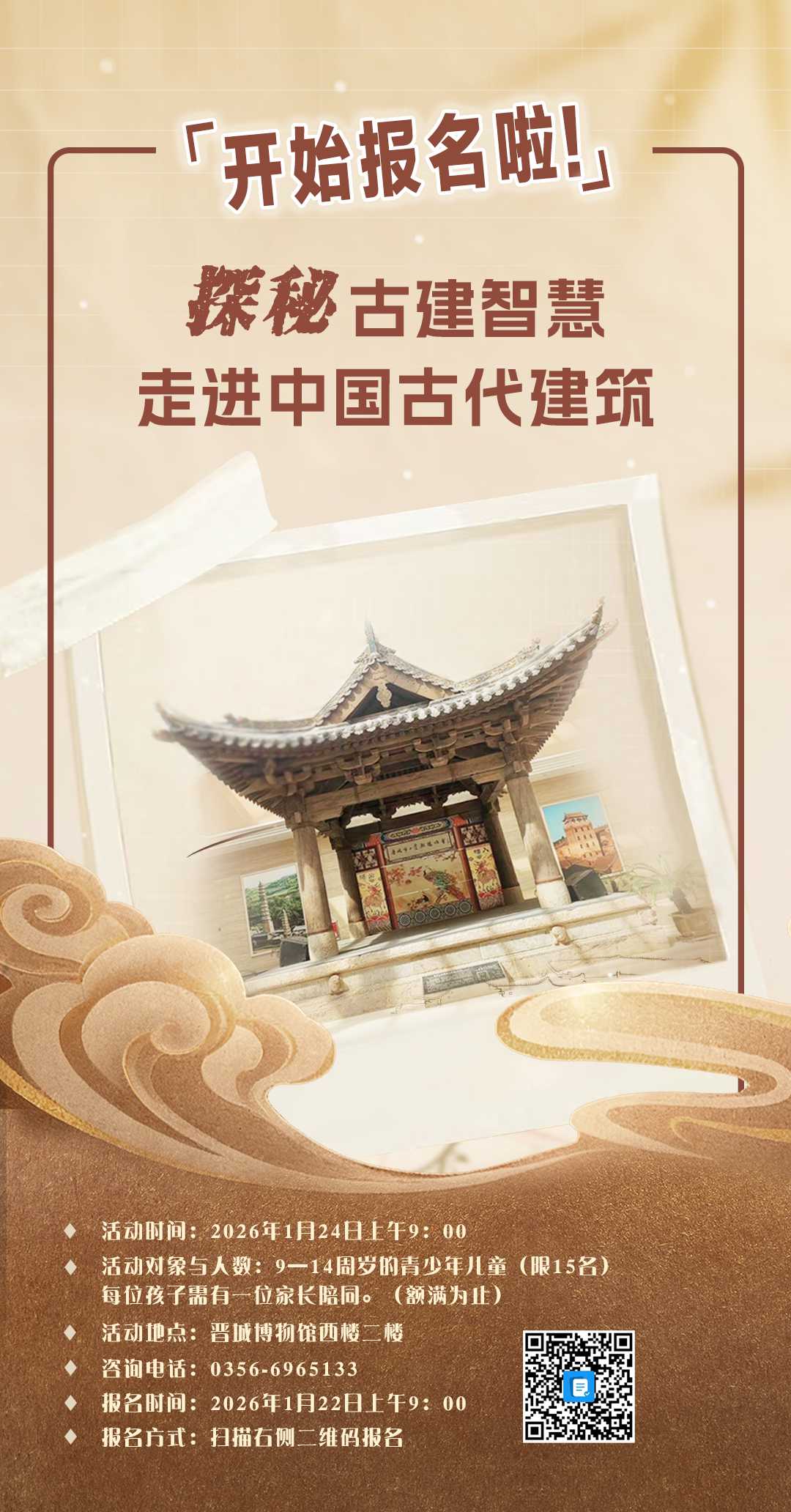 好消息!“探秘古建智慧 —— 走进中国古代建筑”活动开始报名啦,大小朋友快来冲!想知道老祖宗盖房子靠精巧工艺就能稳固千年吗?想解锁斗拱、榫卯、飞檐的神奇奥秘吗?这些藏在木构里的智慧,藏着中式美学与匠人巧思,这场活动统统讲给你听!