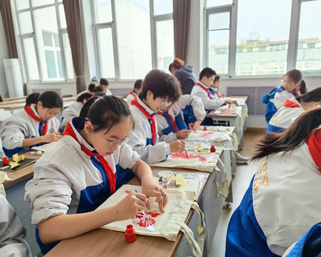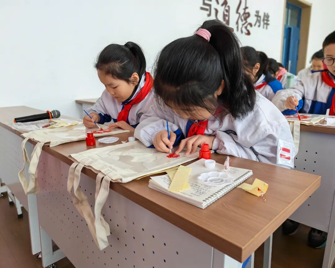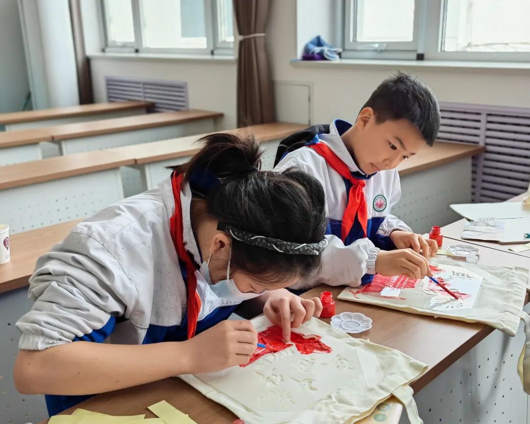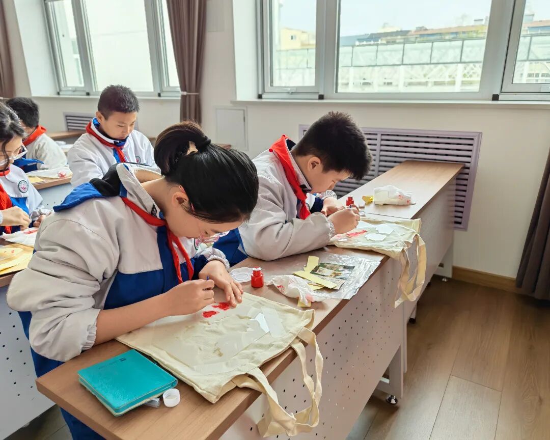 创新活动形式,打造沉浸式红色课堂。现场互动环节,同学们在老师的指导下亲手体验拓印记忆。他们小心翼翼地蘸取颜料,在白色的帆布包上拓印上一个个爱国图案,让文化传承有温度,让爱国教育润童心。
