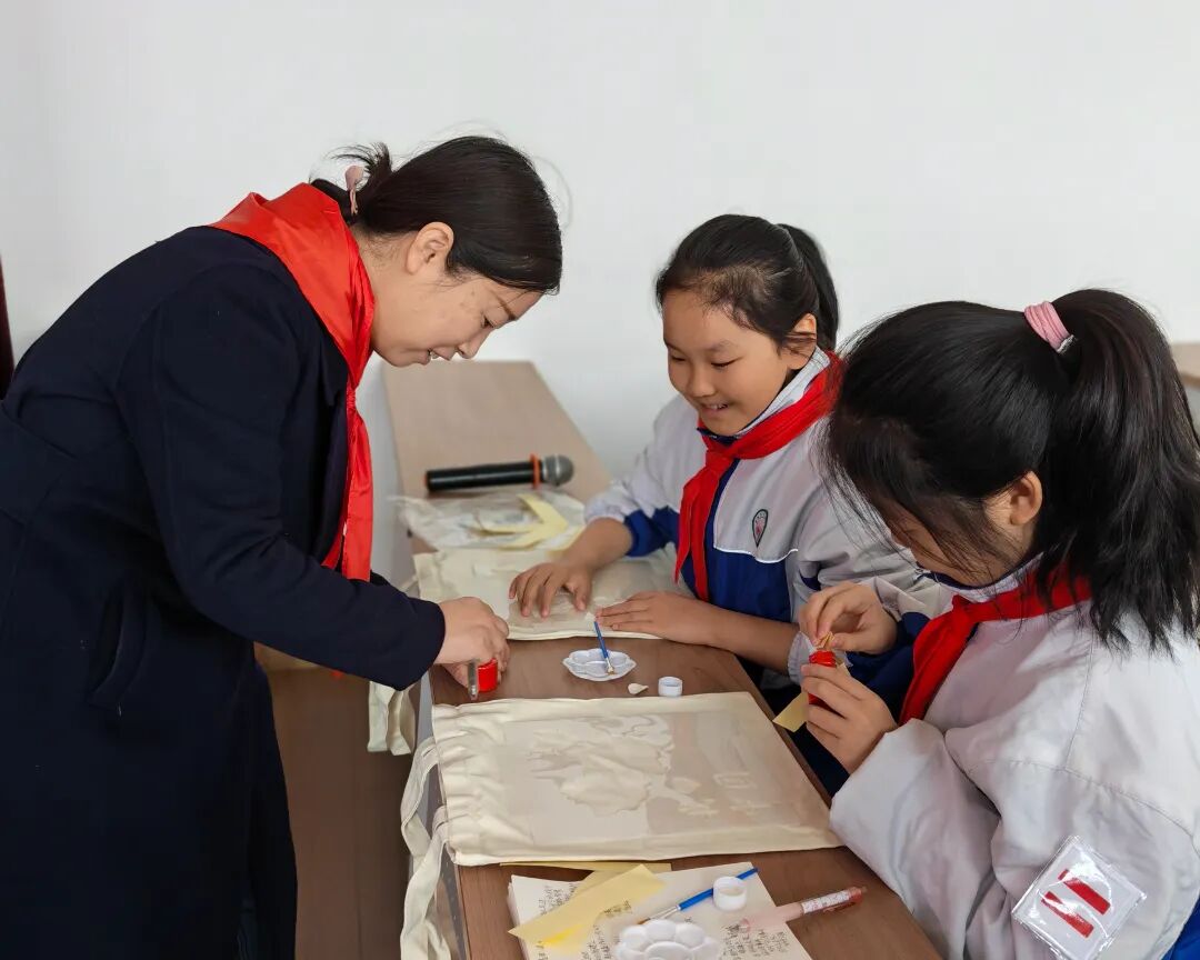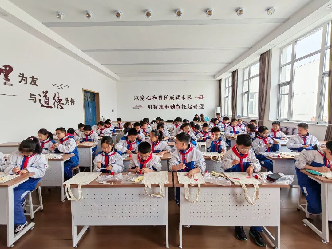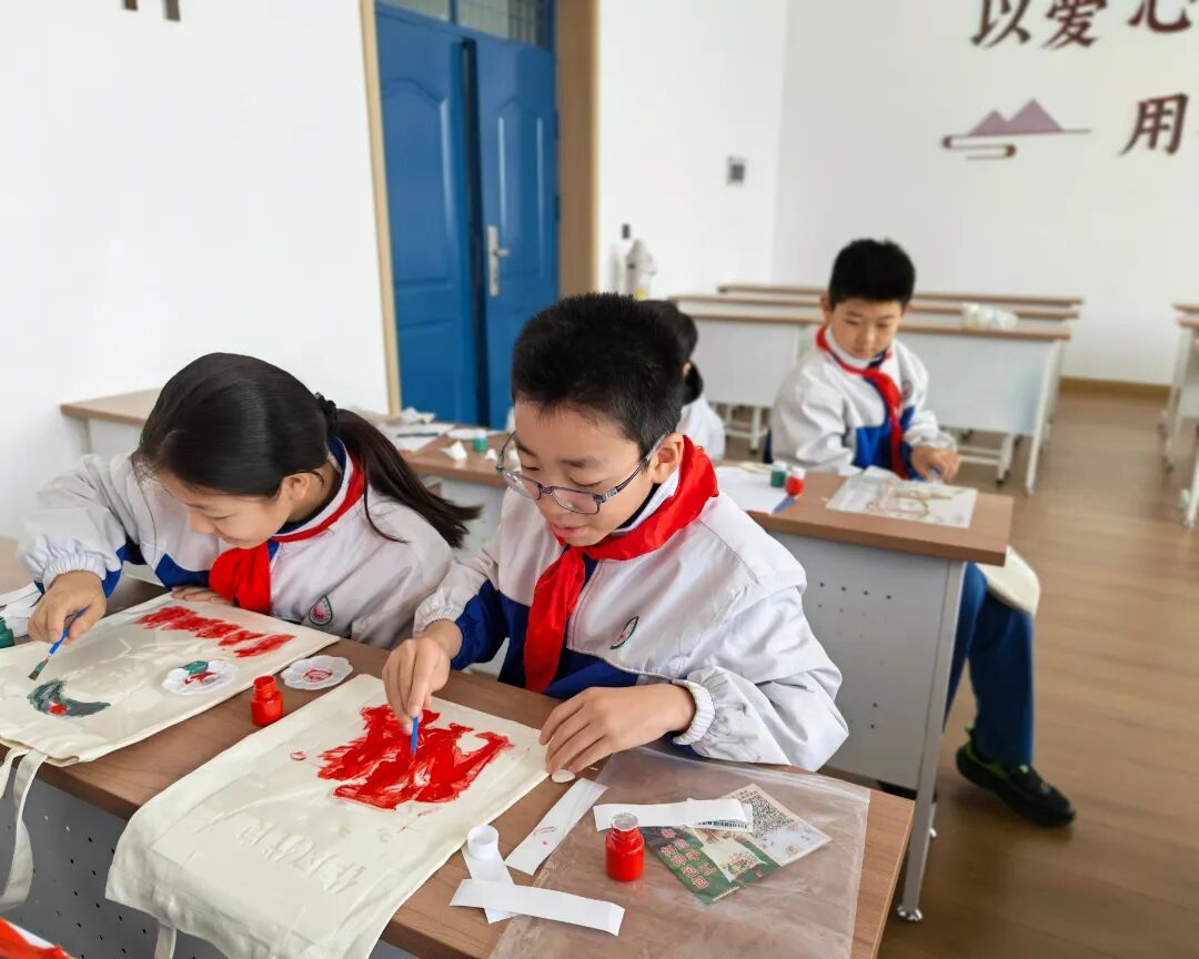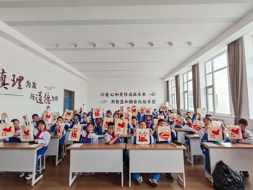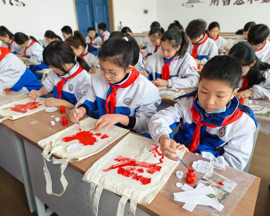 创新活动形式,打造沉浸式红色课堂。现场互动环节,同学们在老师的指导下亲手体验拓印记忆。他们小心翼翼地蘸取颜料,在白色的帆布包上拓印上一个个爱国图案,让文化传承有温度,让爱国教育润童心。