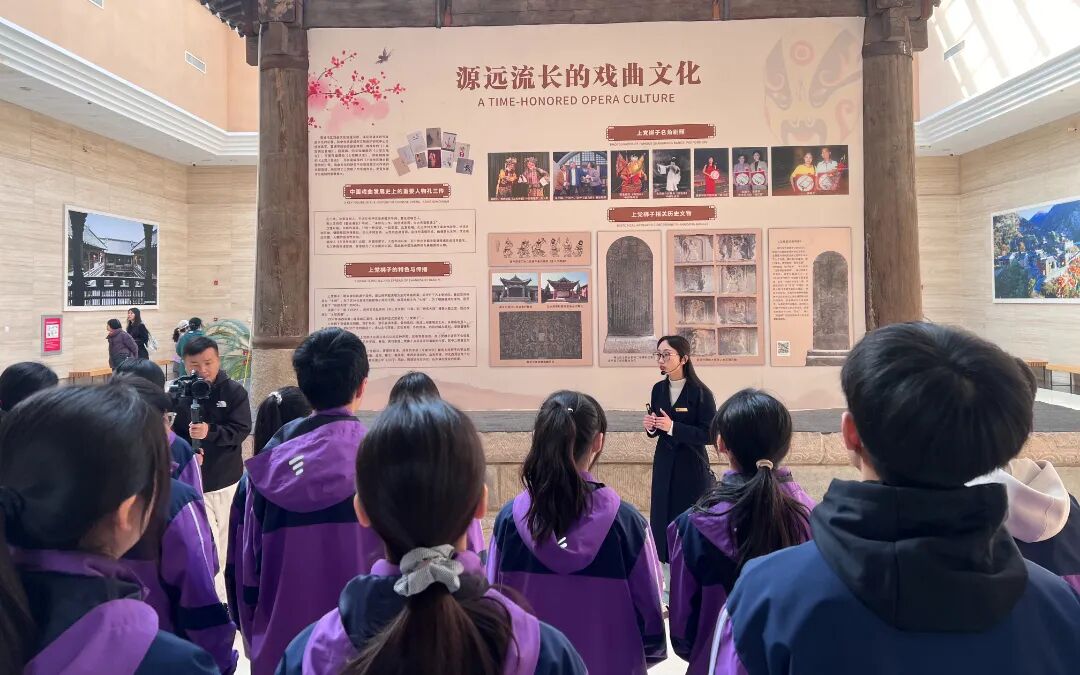 活动从四楼展厅启程,同学们驻足于金代戏台(等比例复原),听讲解员讲述这座古老戏台的前世今生——那曾是上党梆子唱响的舞台,是晋城地方戏曲发展的见证者。在这里,大家认识了首创“诸宫调”的孔三传,了解了上党梆子五种声腔的独特魅力。